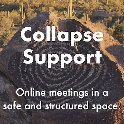 - Collapse Support: We convene weekly meetings online to provide a safe space for people to metabolize the difficult emotions that arise from becoming aware of collapse, like climate anxiety, eco-grief, and worry about the future.