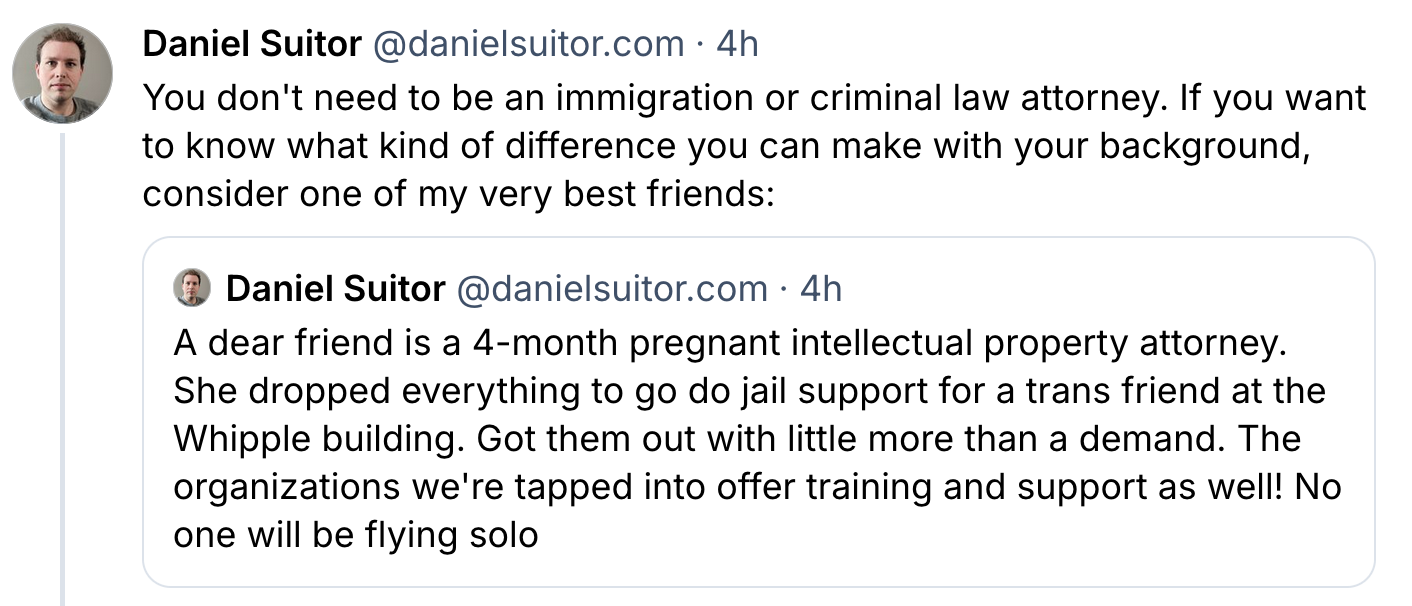 This is what is happening in Minnesota right now. The horror, grief and fear we are all experiencing every day, watching our neighbors get hauled away by reckless, cruel, masked paramilitaries; trying to protect one another; and knowing that what they did to Renee Nicole Good could happen to any of us, is generating this: unexpected, heartfelt new connections of not just solidarity but real love. At a massive, simply-incomprehensible scale. Good people coming together in all our fear and vulnerability and care and kindness and bravery, discovering the transformative power of our love for one another.
