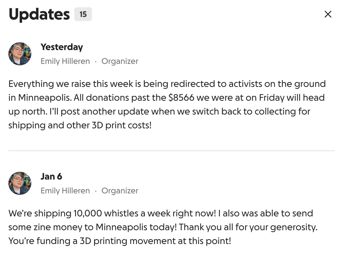 Emily Hilleren in Chicago is shipping 10,000 3D-printed whistles per week to enable community warnings about ICE. This week, she diverted her output to Minneapolis.